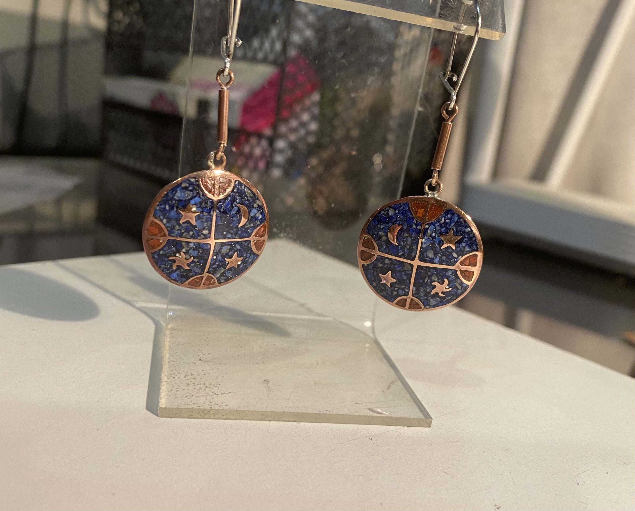 Aros cobre lapislázuli,diseño kultrun .hecho a mano Handmade,Copper lapislázuli EARINGS, indian DESIGN .Handmade