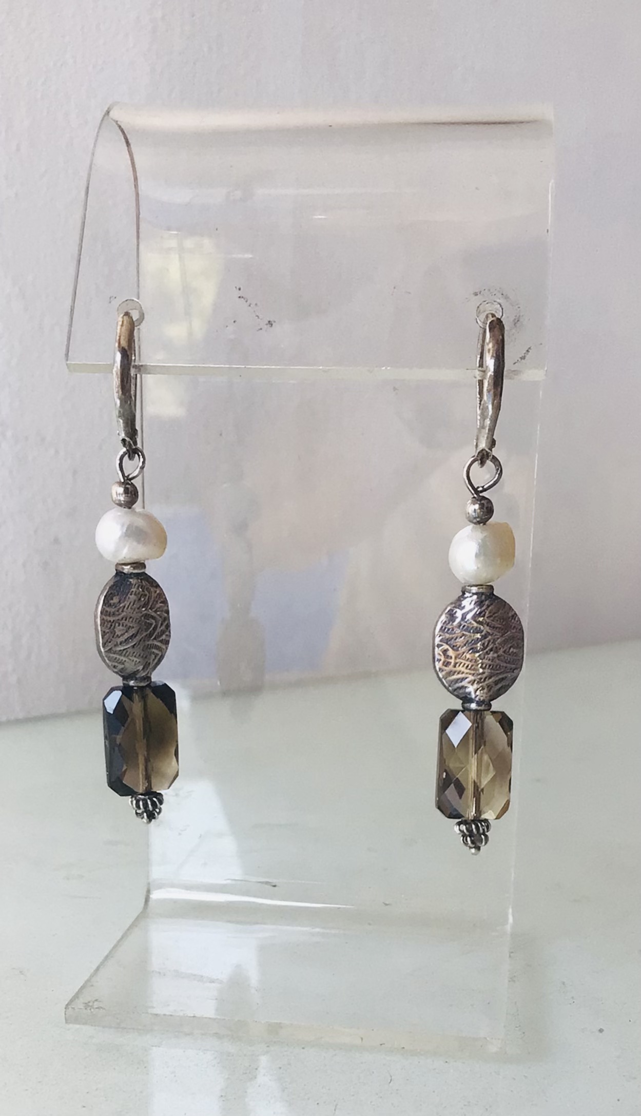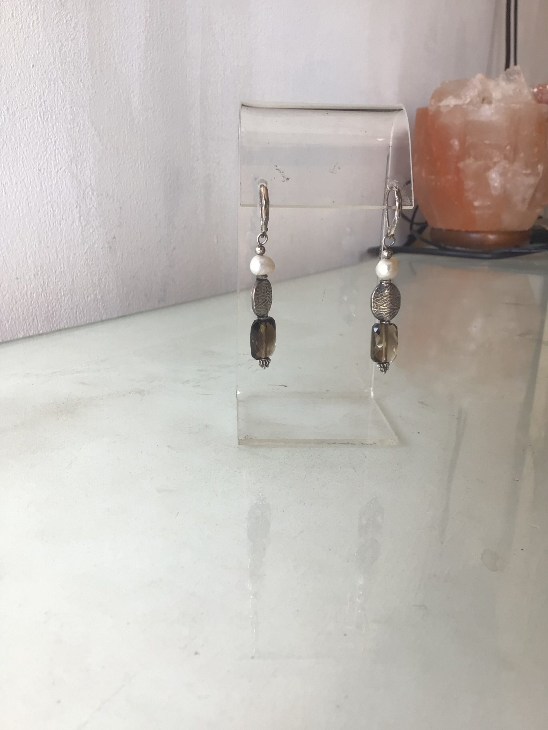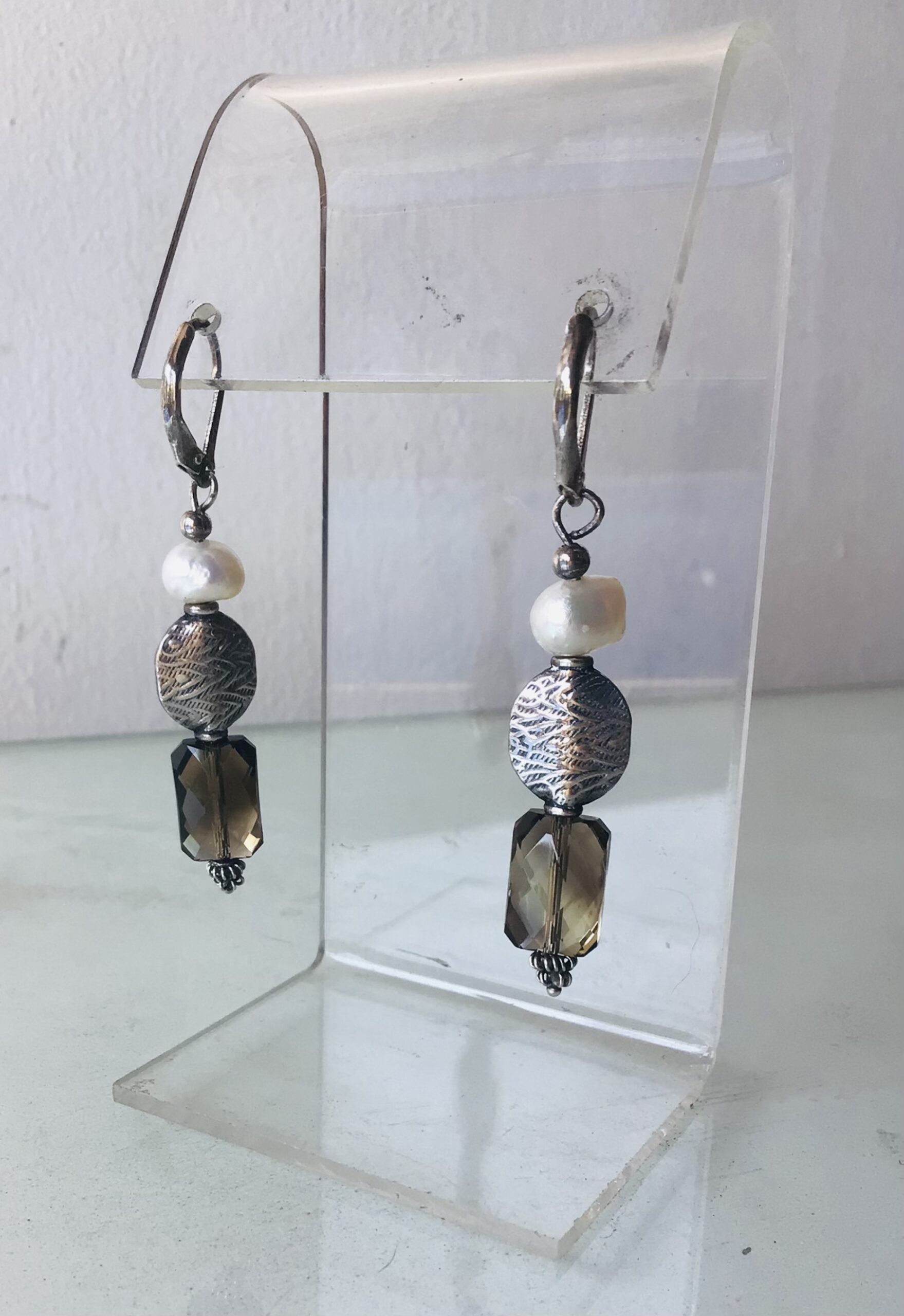 Aros Plata colgantes con topacio fume facetado y perla de rio
