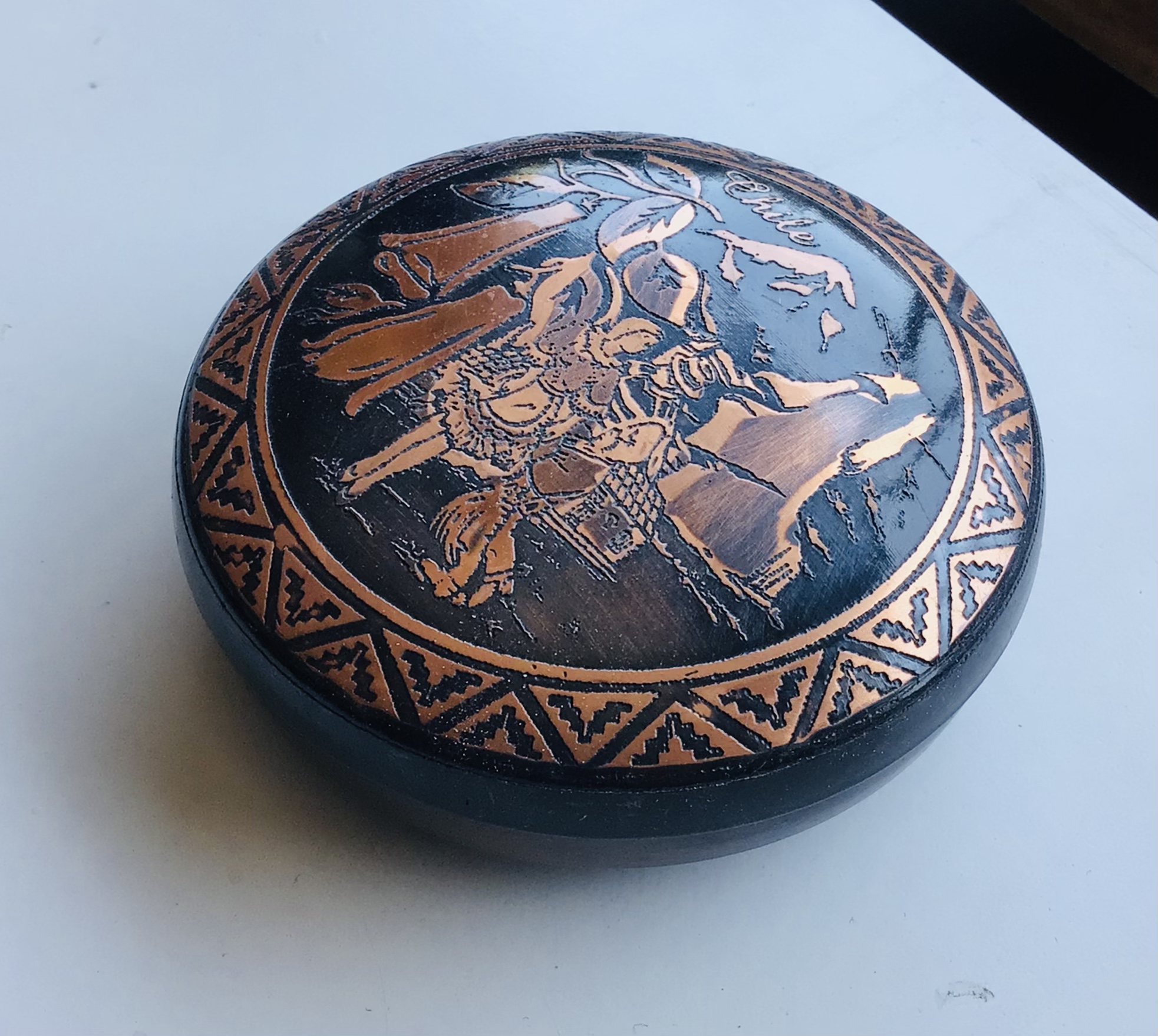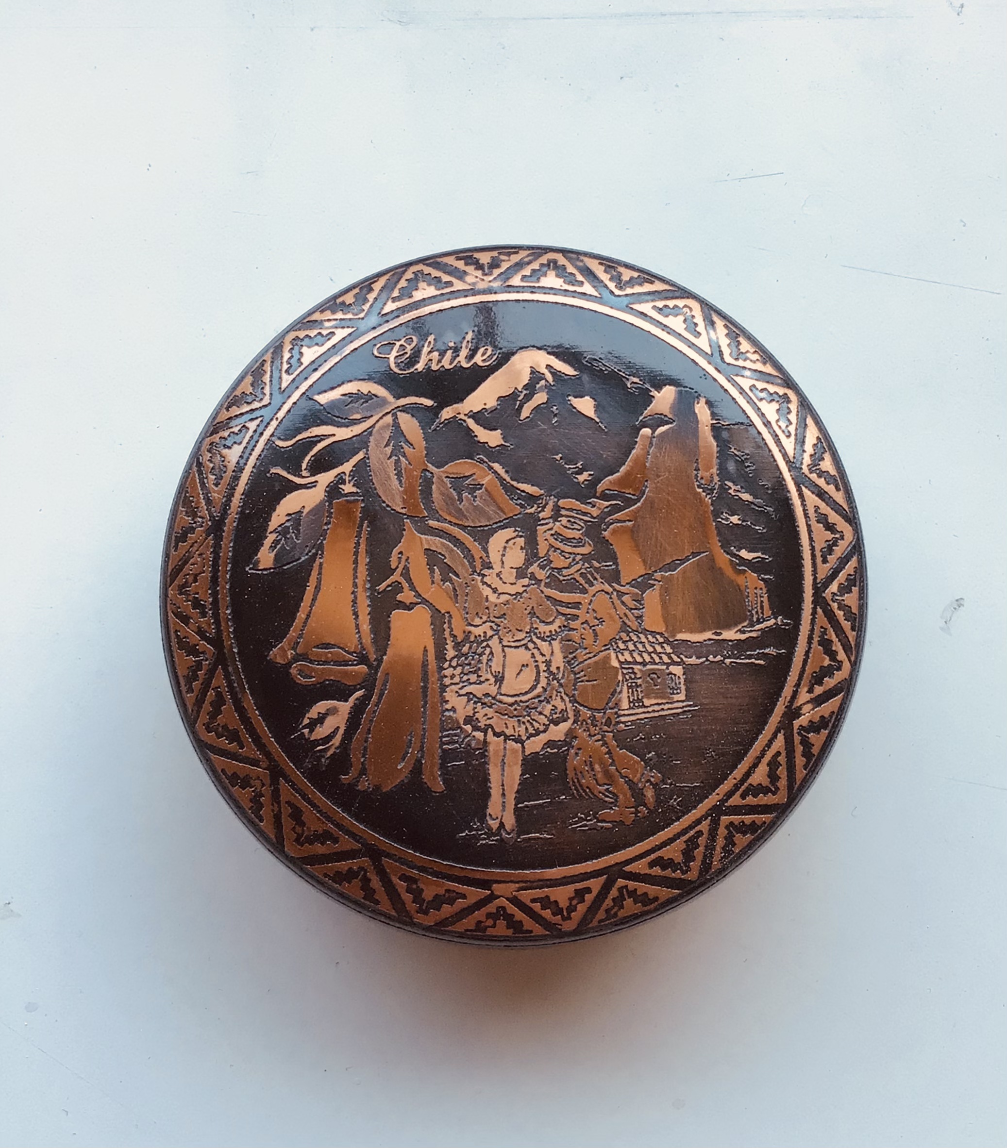 Caja cobre diseños chilenos .Diámetro 8cm .Hecha a mano