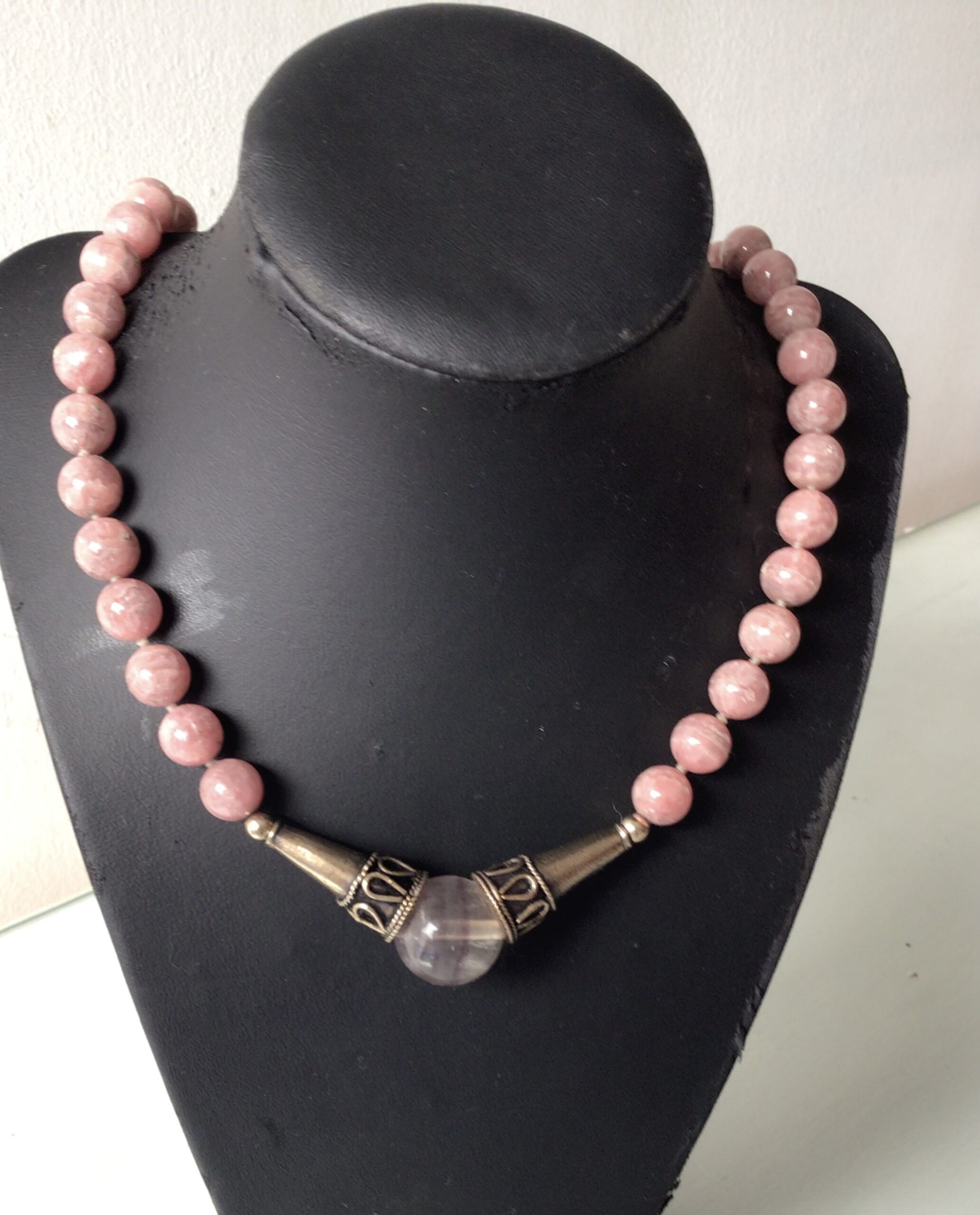 Rhodochrosite 10 ml necklace with bronce and tourmaline .