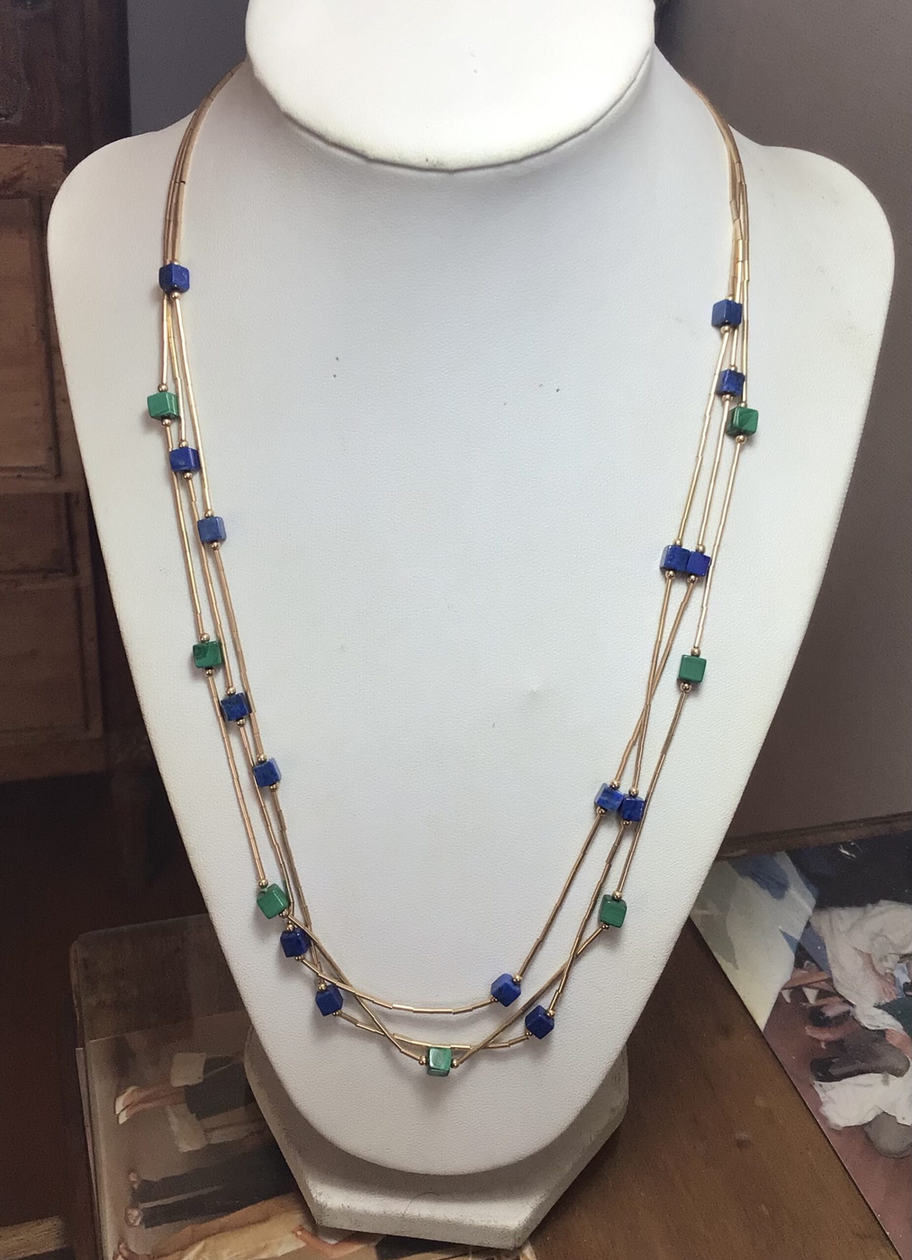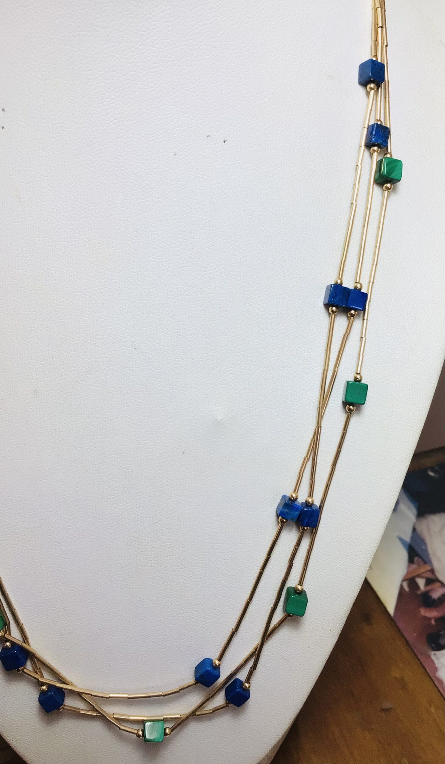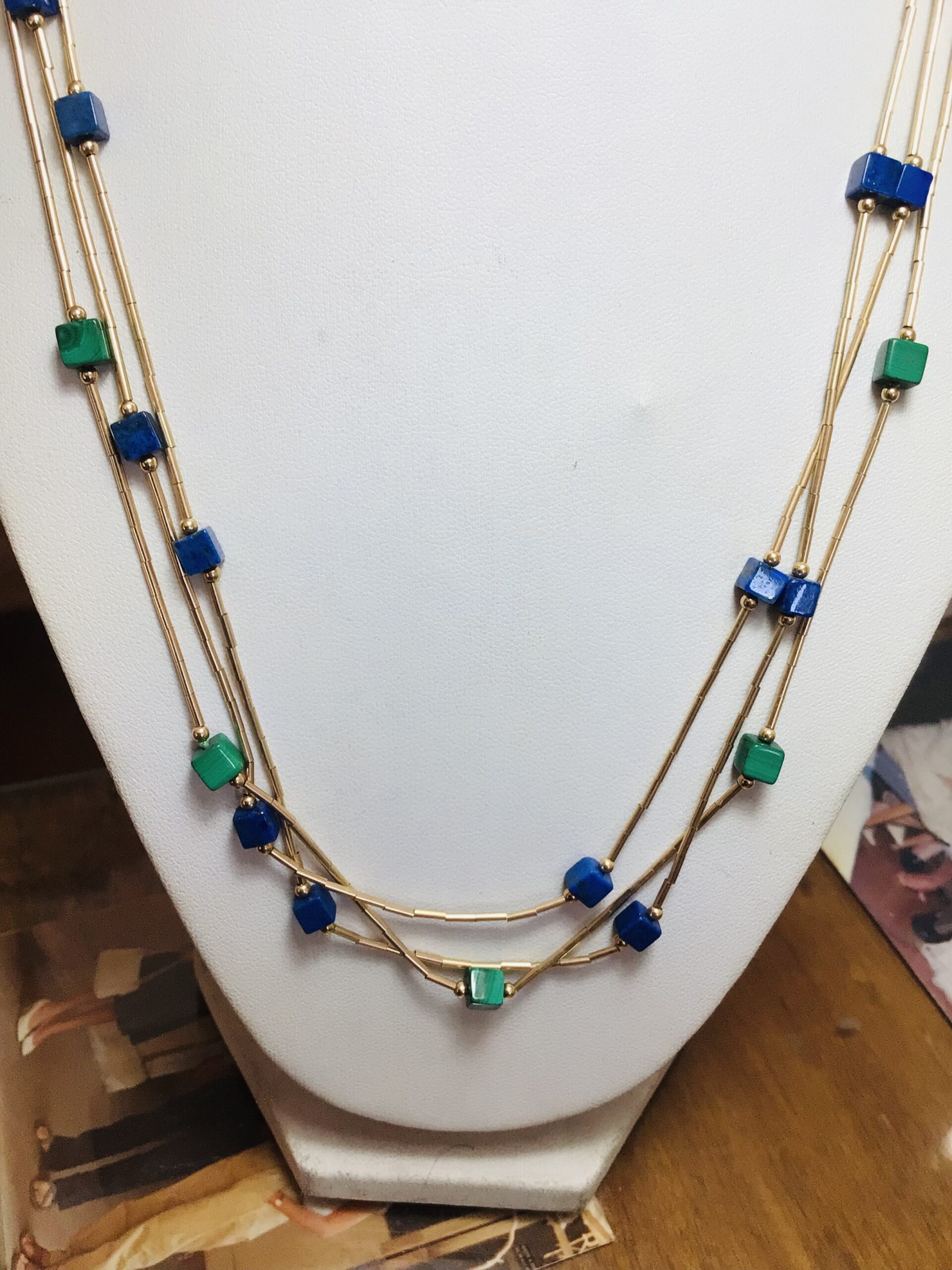 Triple necklace with cubes of lapislázuli and malachite 14k goldfilled.filled