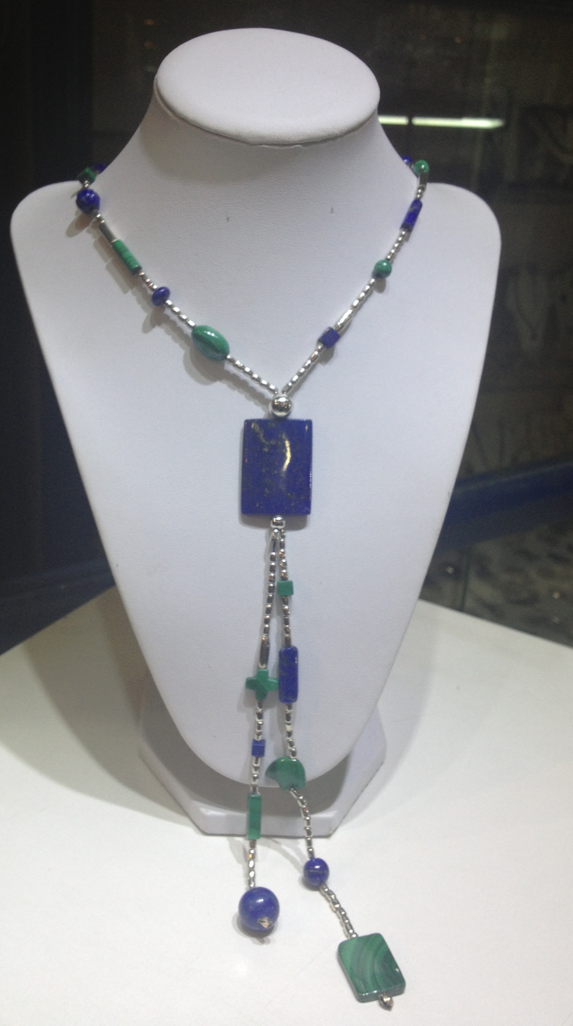 Silver long neckace with different forms of Lapislzuli and Malaquite stones.