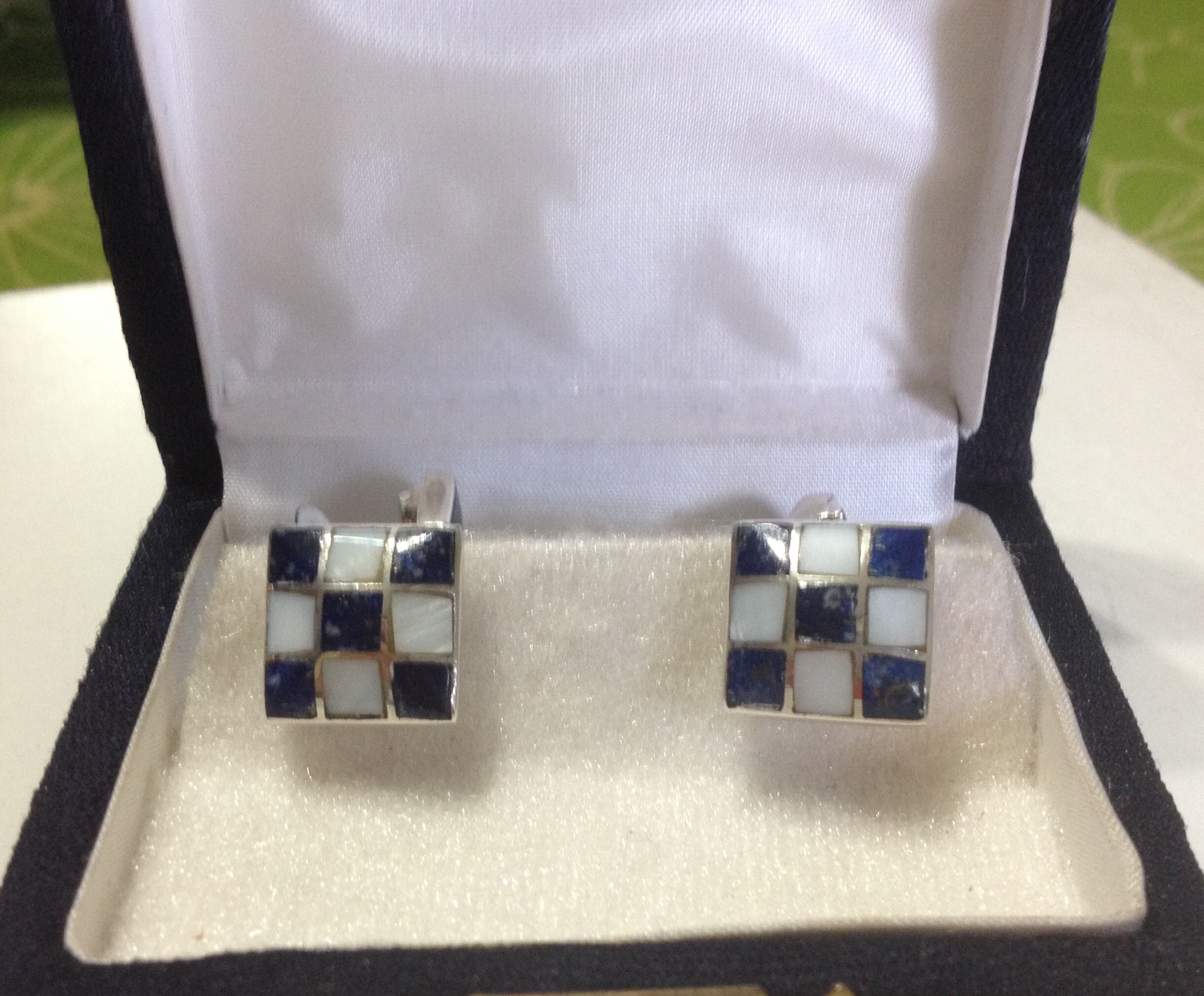 Colleras plata ,piedras por ambos lados, hechas a mano. Silver cufflinks,stone also in the back,lapislázuli and mother of Pearl.