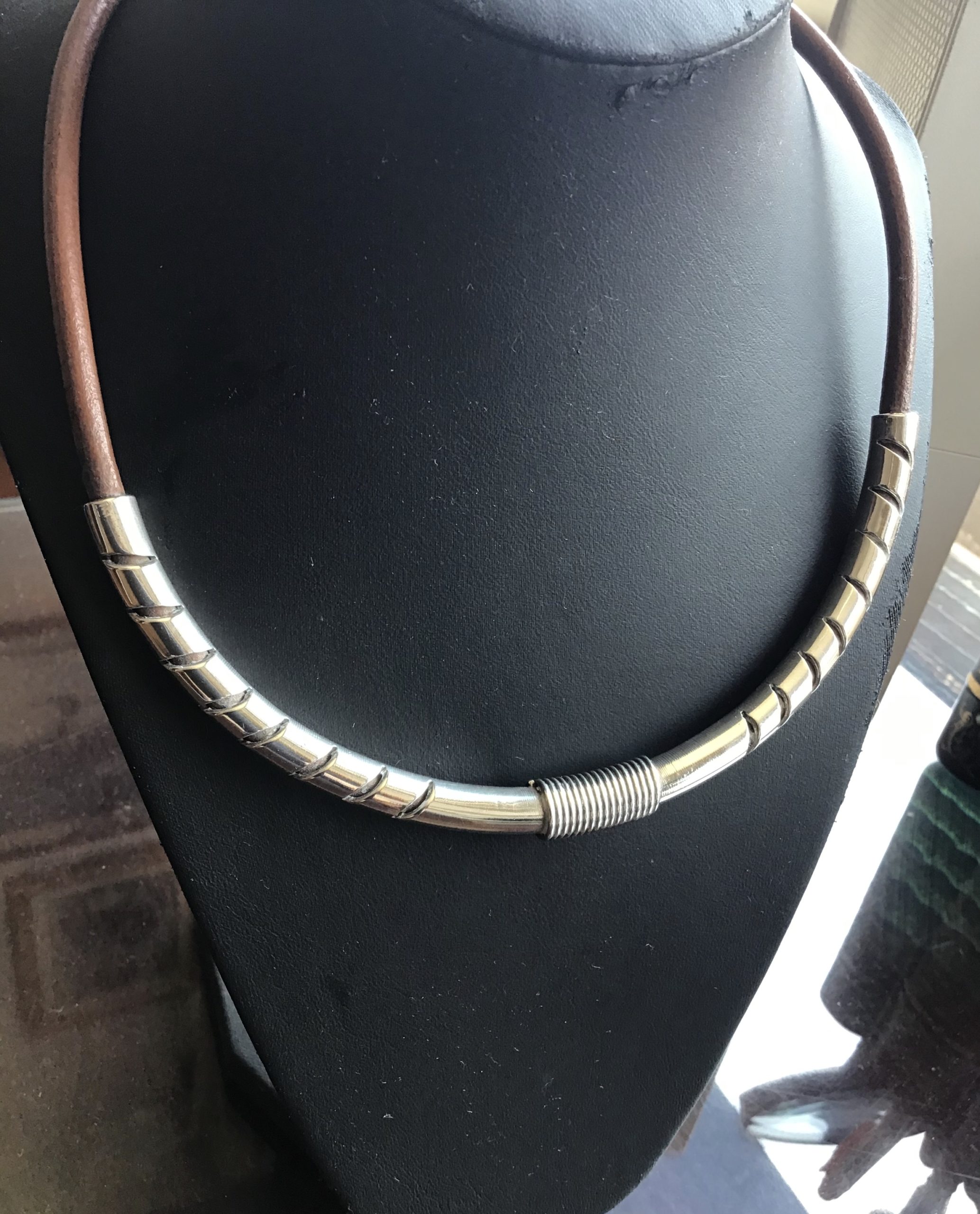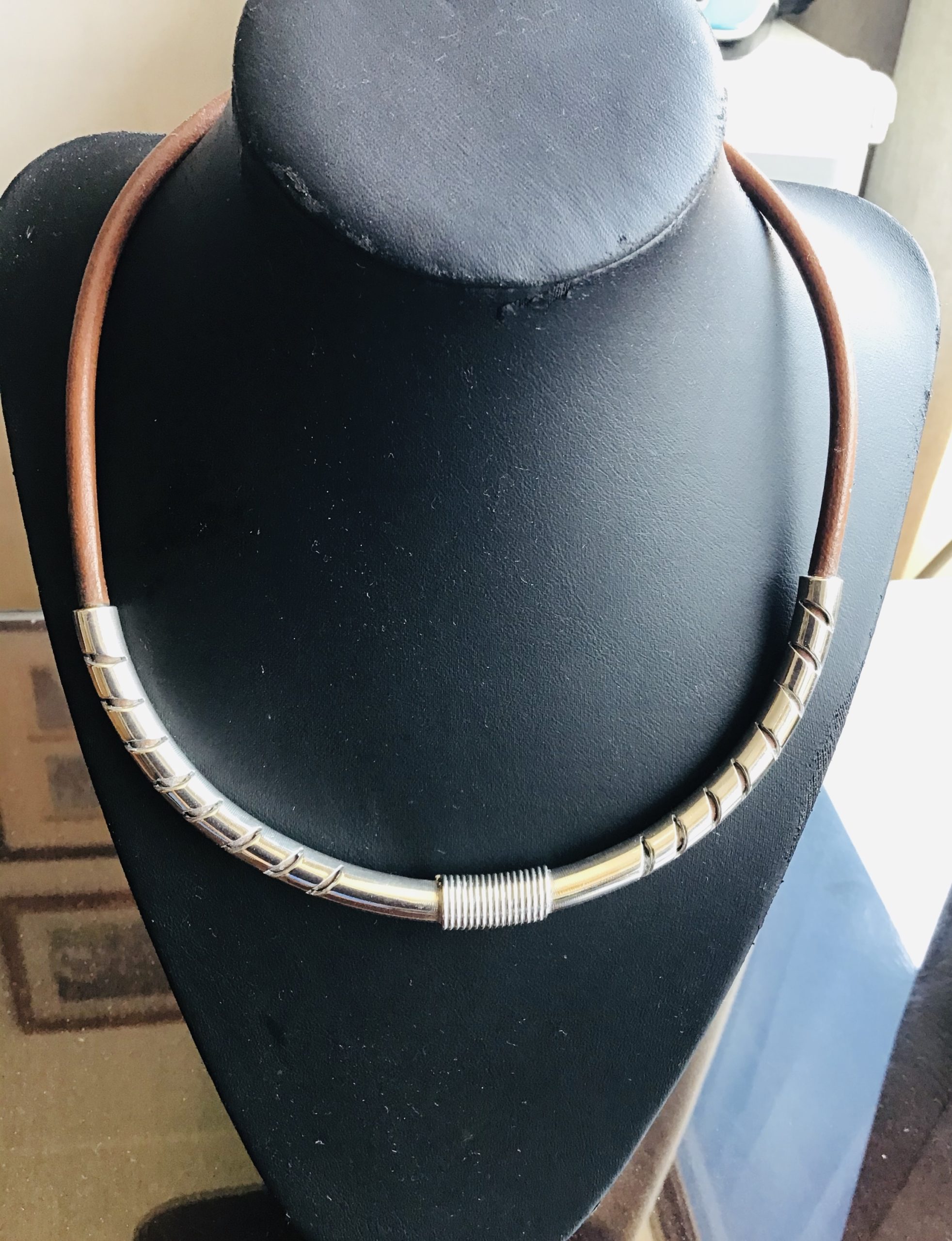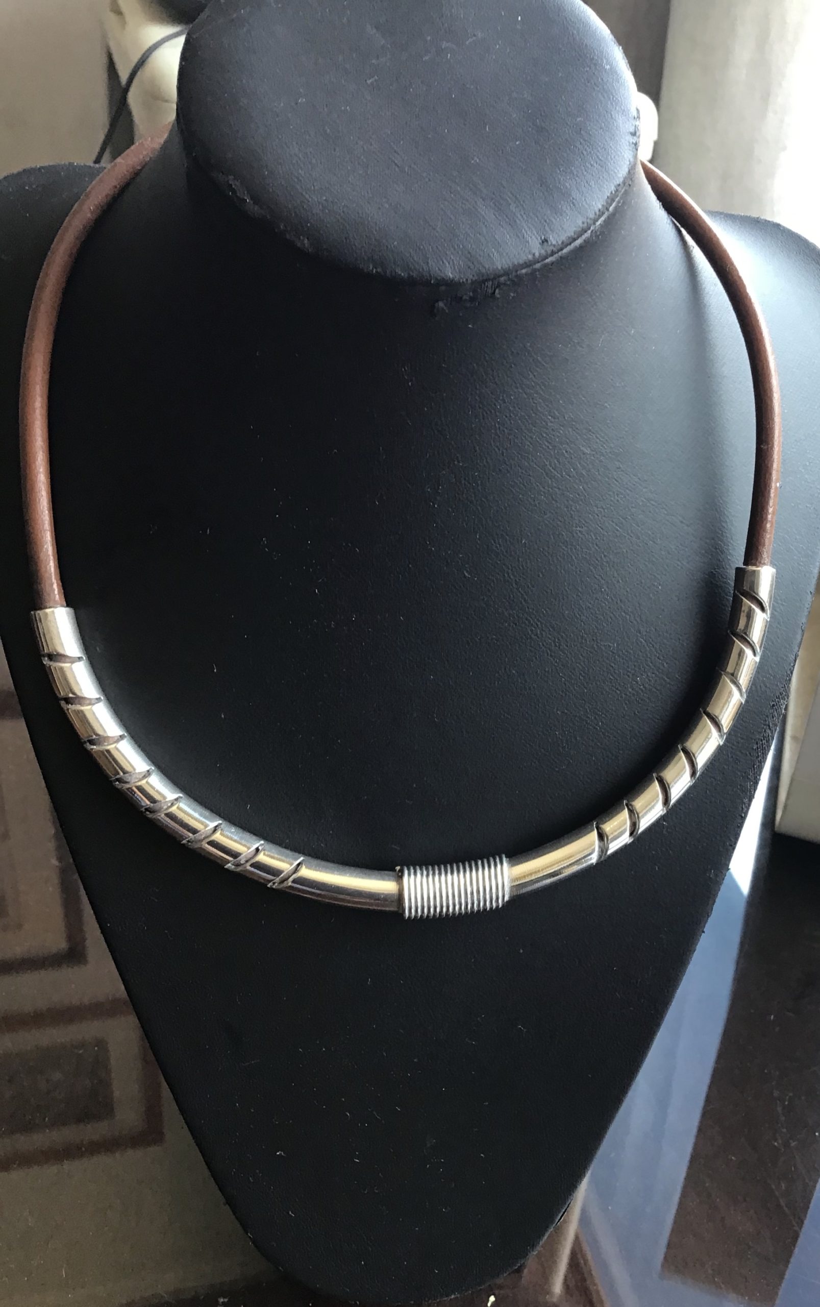 Collar Plata sólido con cuero café grueso Solid Silver necklace WITH Thick brown leatber
