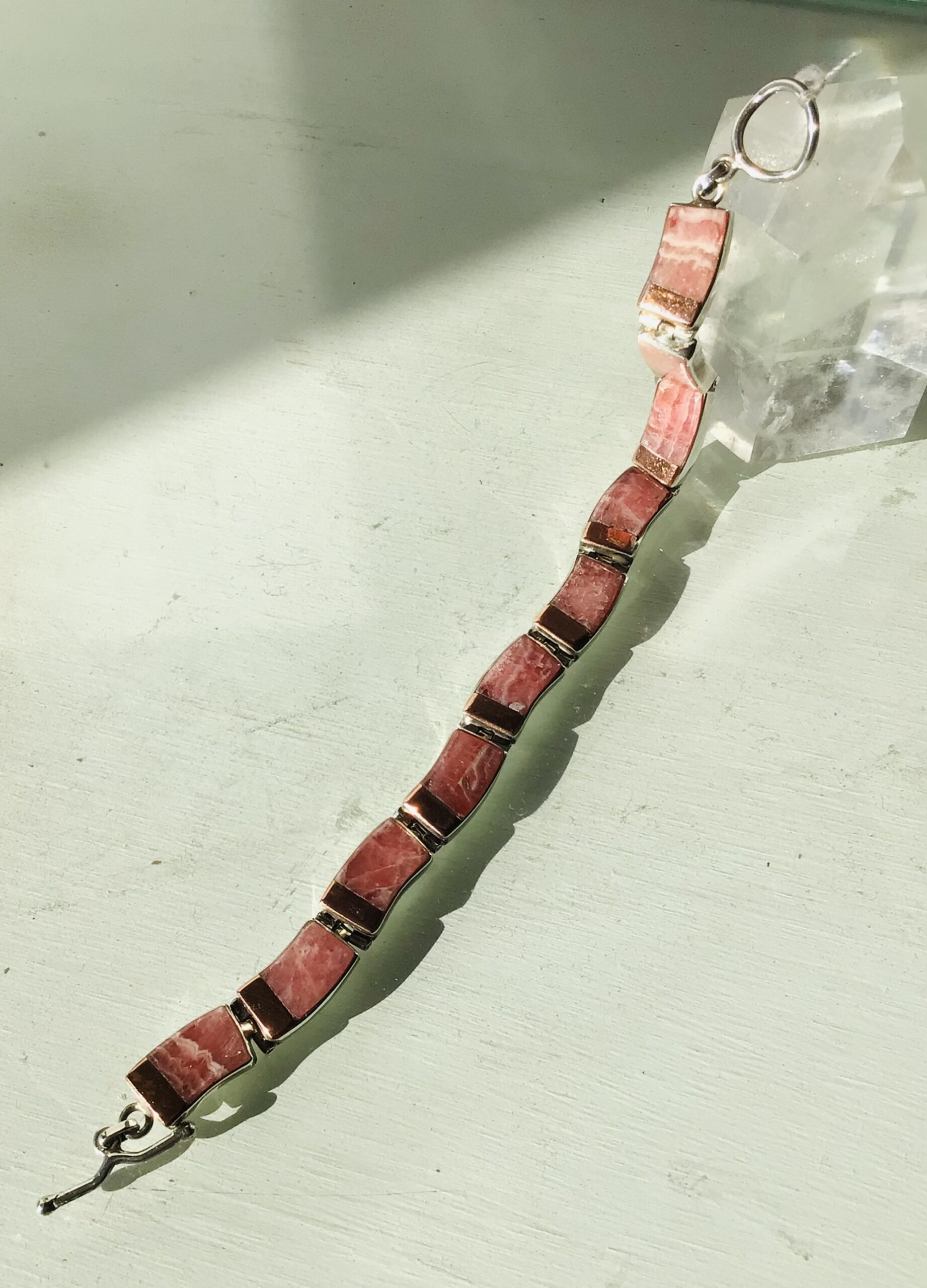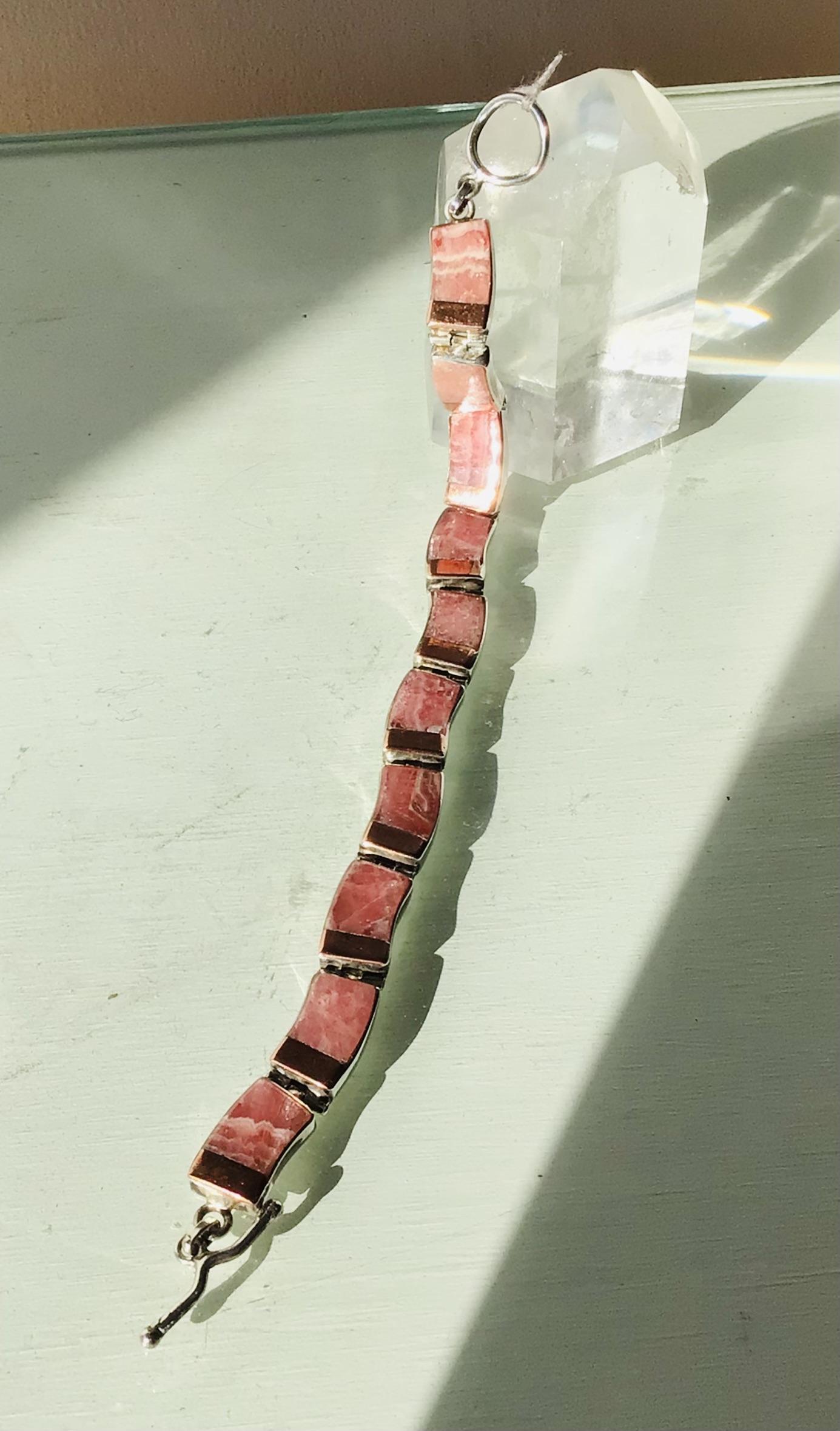 Pulsera Plata bronce con rodocrosita,hecha a mano. Handmade silver and bronce rhodochrosite bracelet.